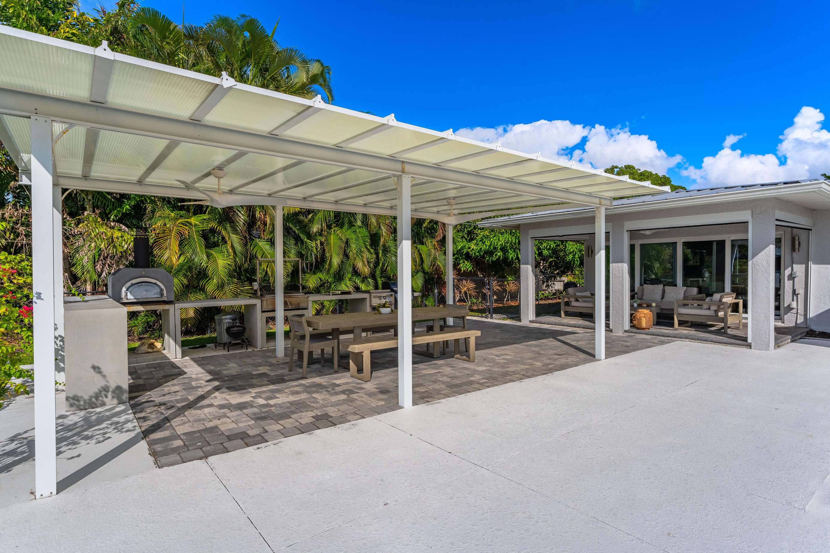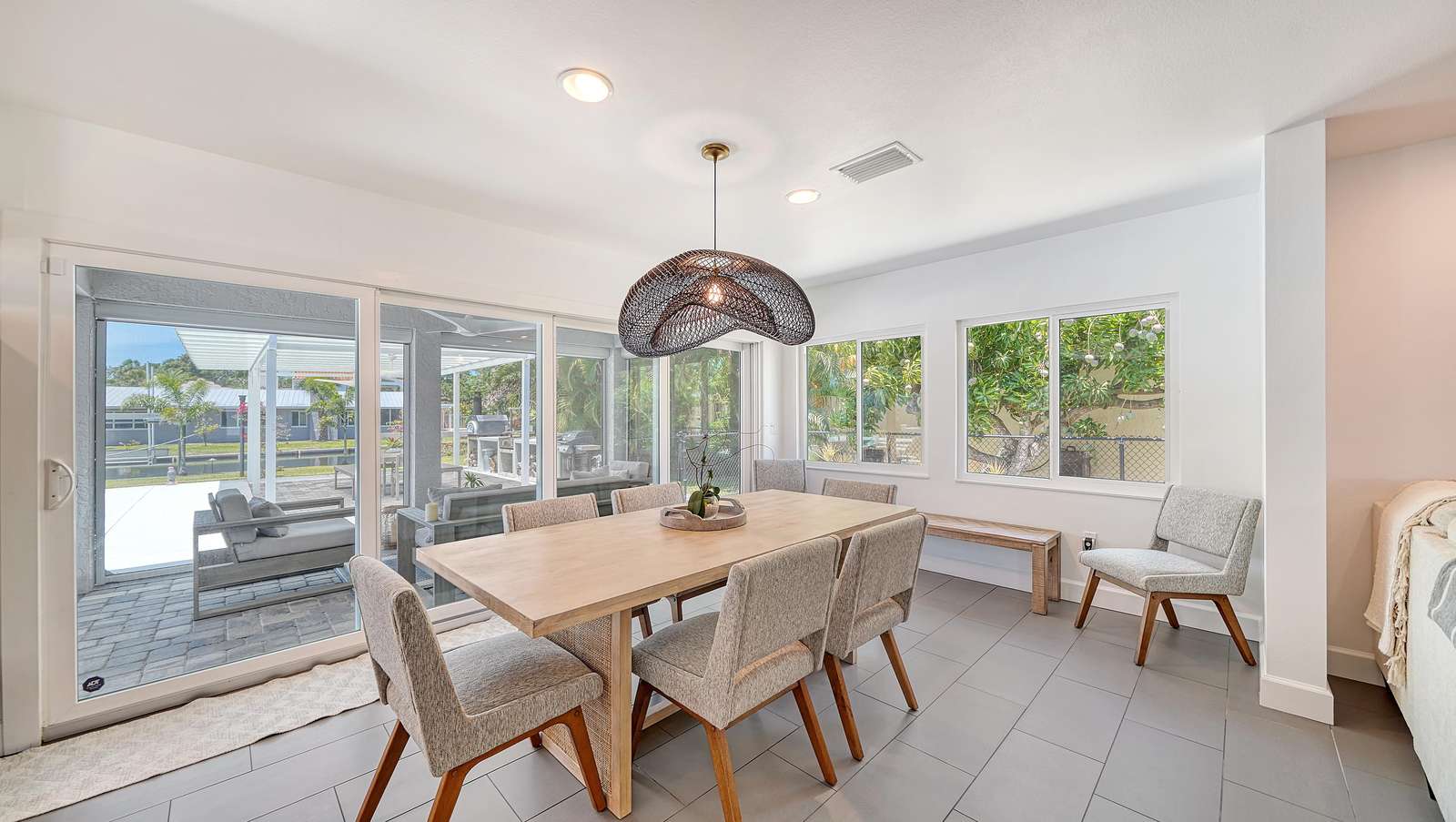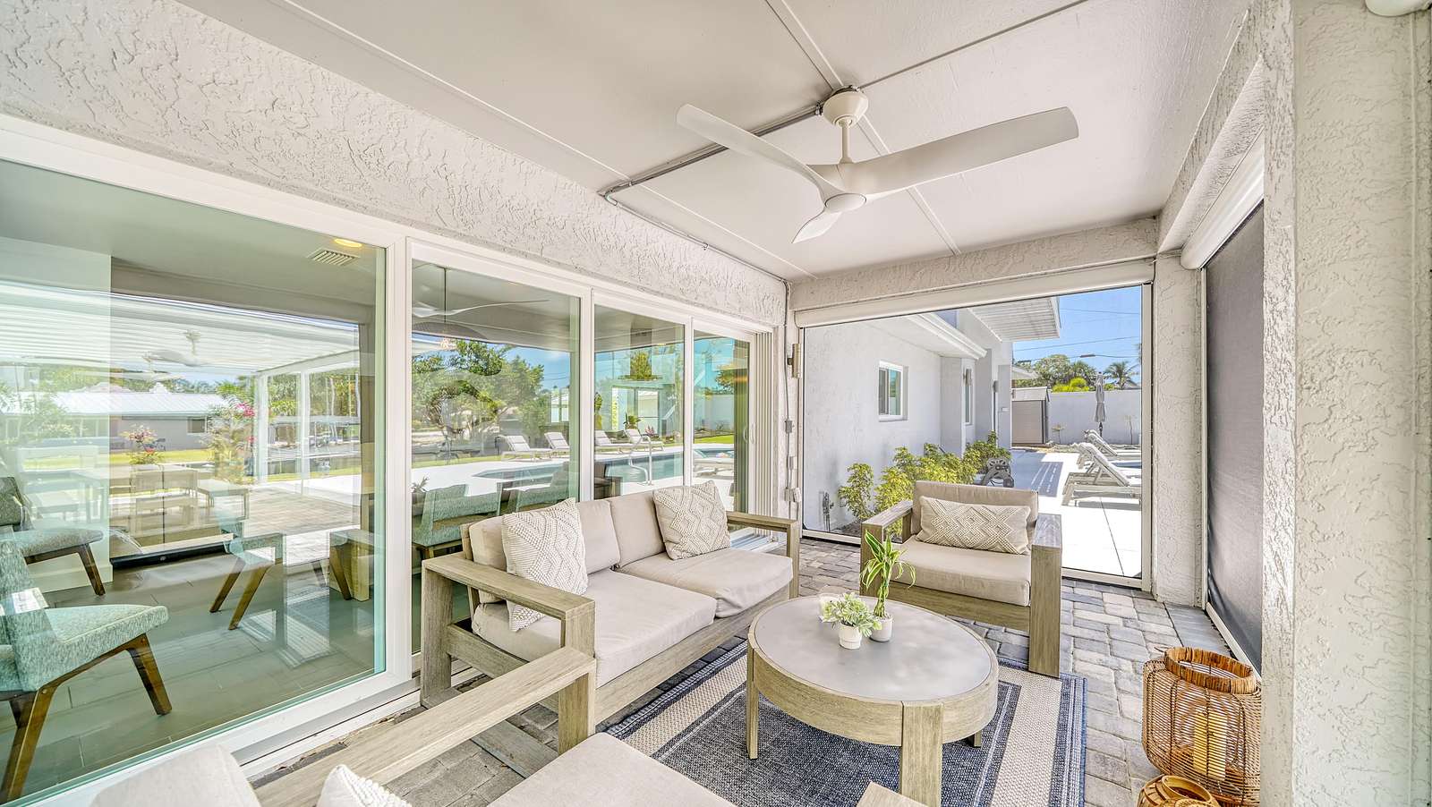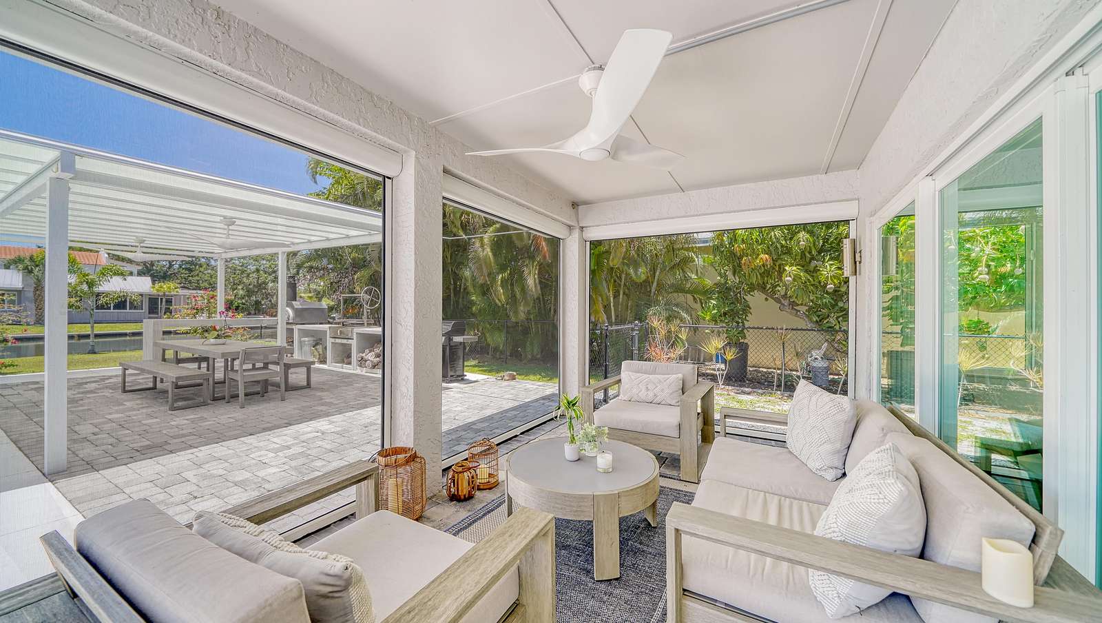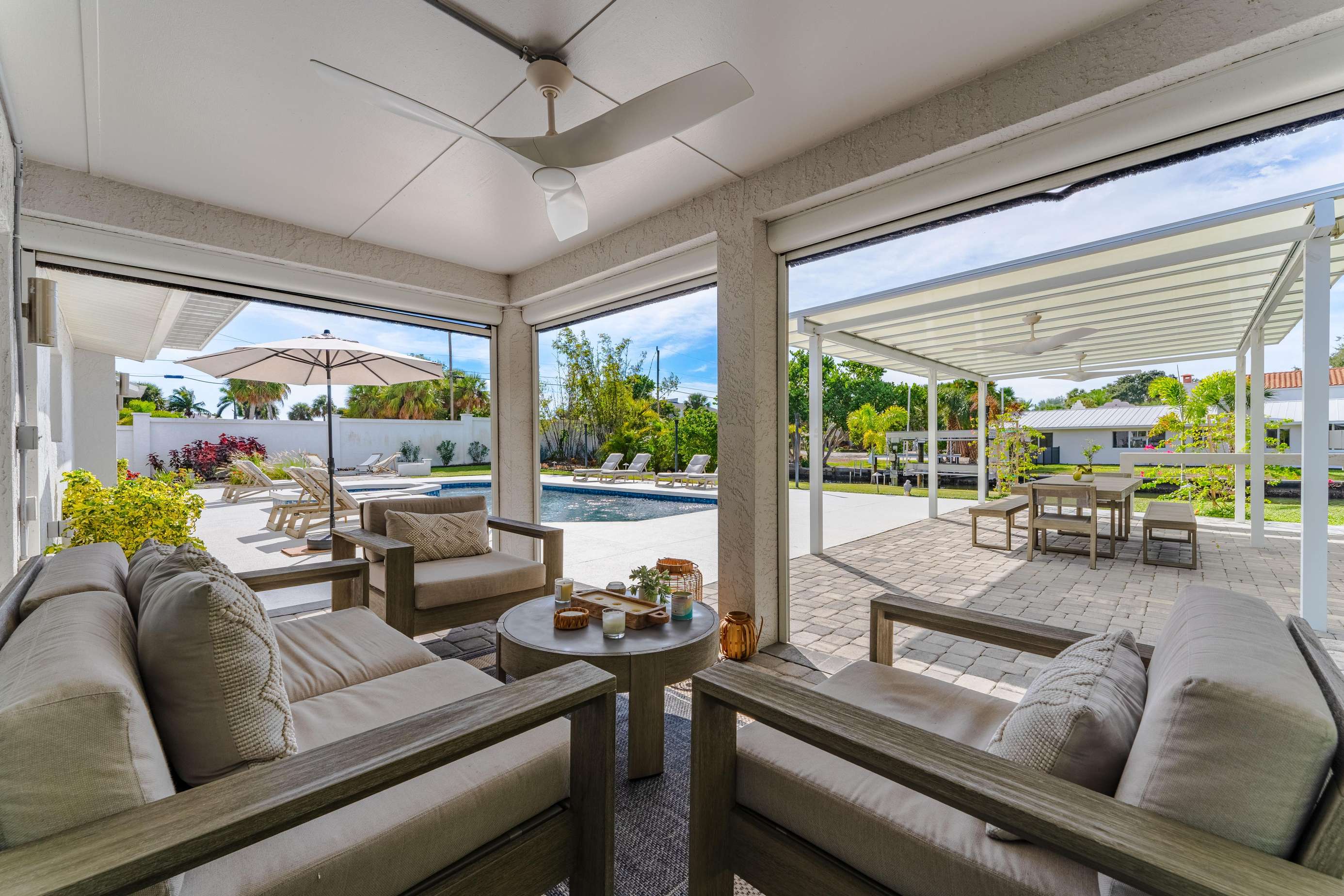 The lanai features outdoor furniture where you can relax and enjoy the Floridian weather.