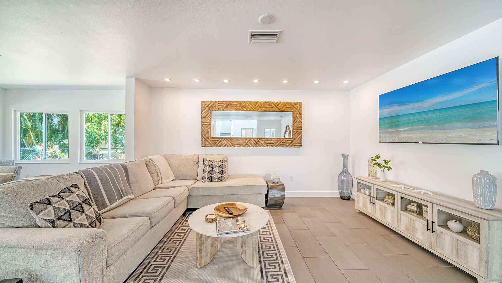 On the right hand side of the 1st floor you can find the 1st living room. It is luminous with large sliding windows that lead to the lanai and then the pool. The living room is cosy with a L shaped couch and TV.