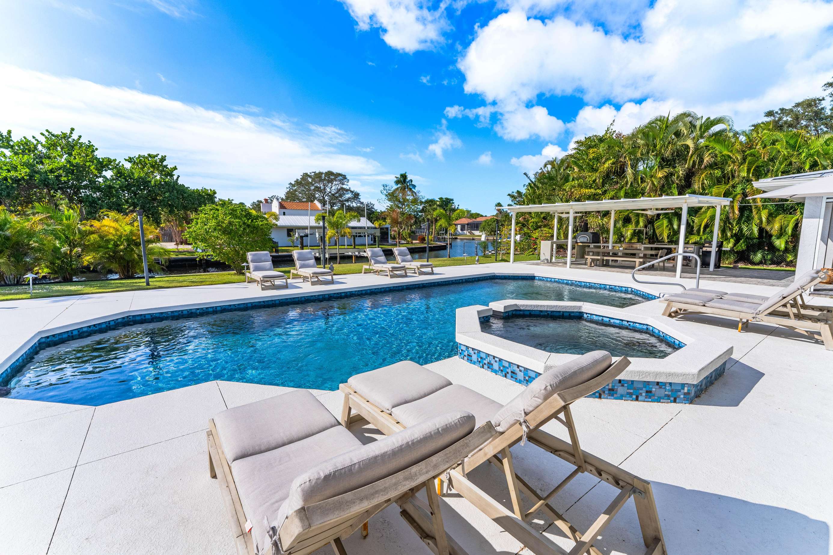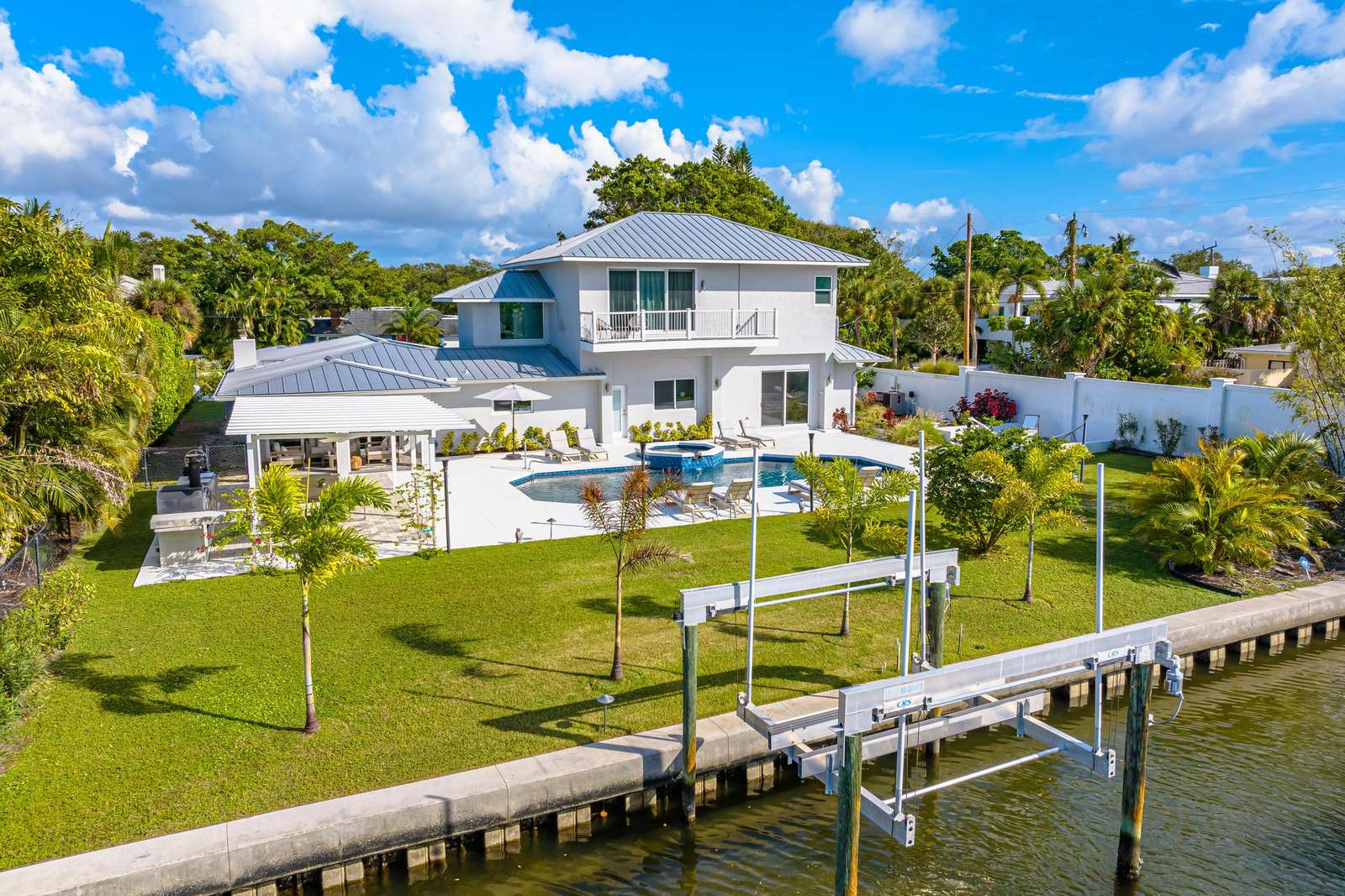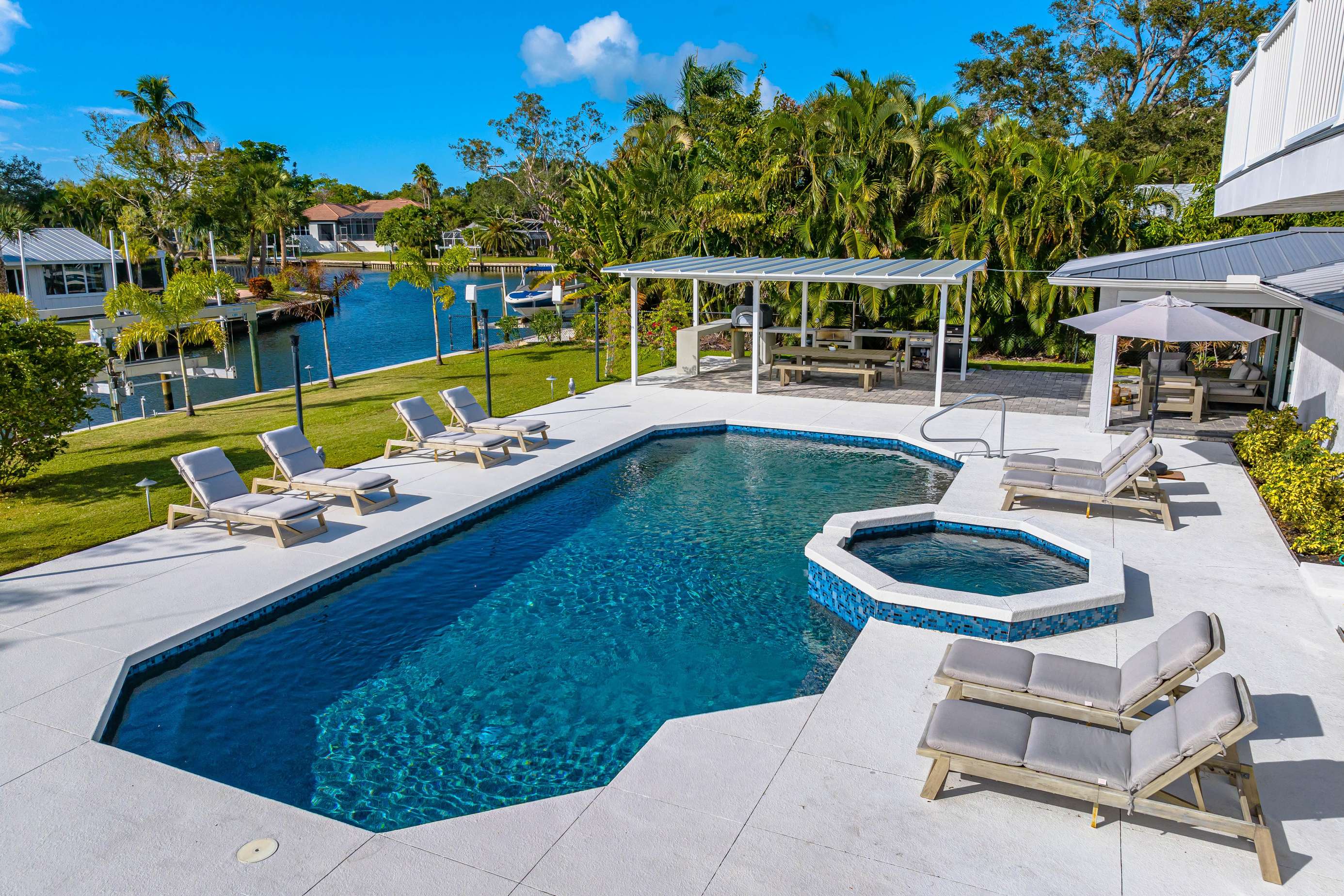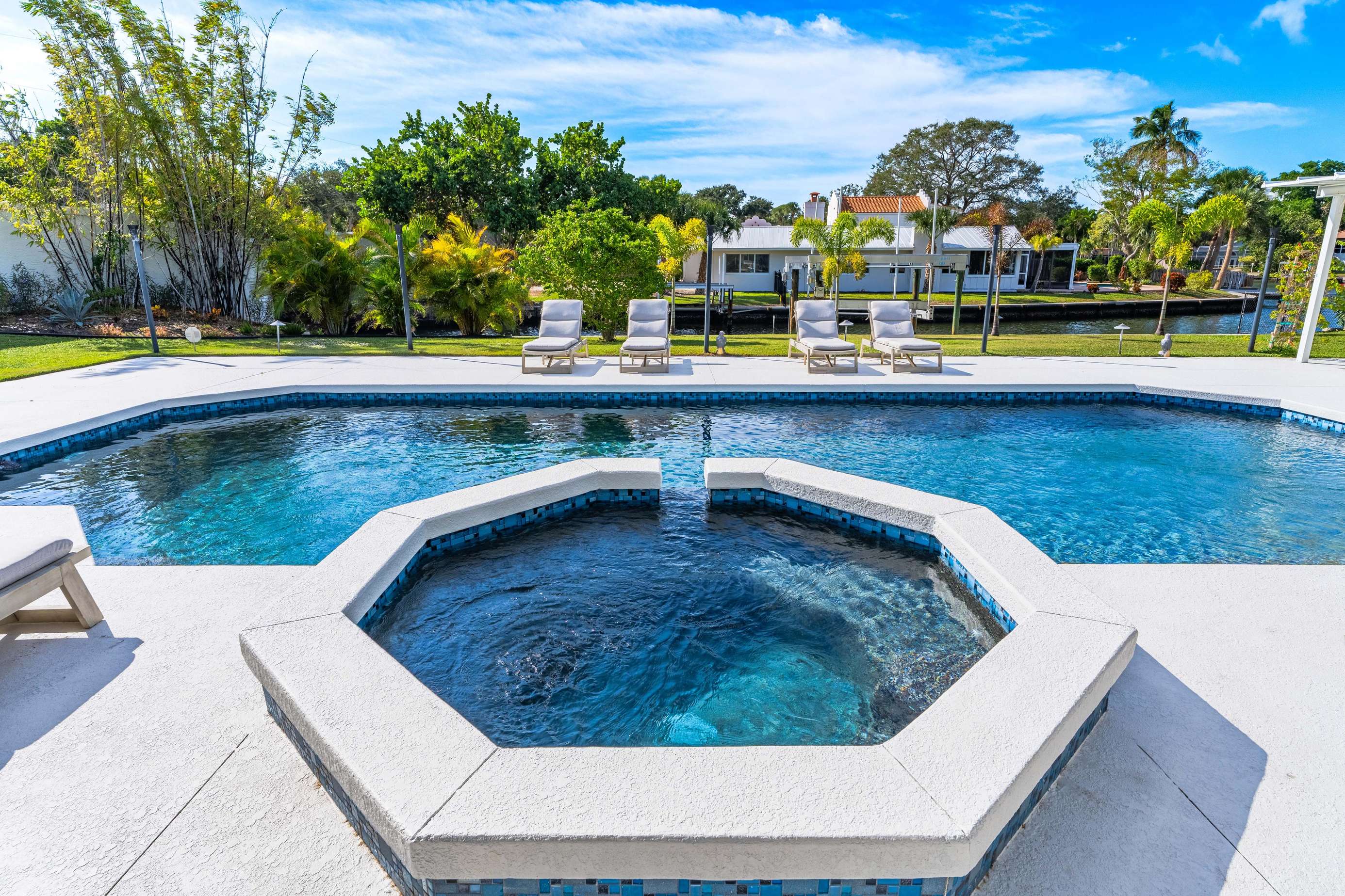 This spacious and beautiful house on the canal with a heated saltwater pool is 3,824 sq ft with 4 bedrooms and 4.5 bathrooms. Boat dock with lift available upon request.