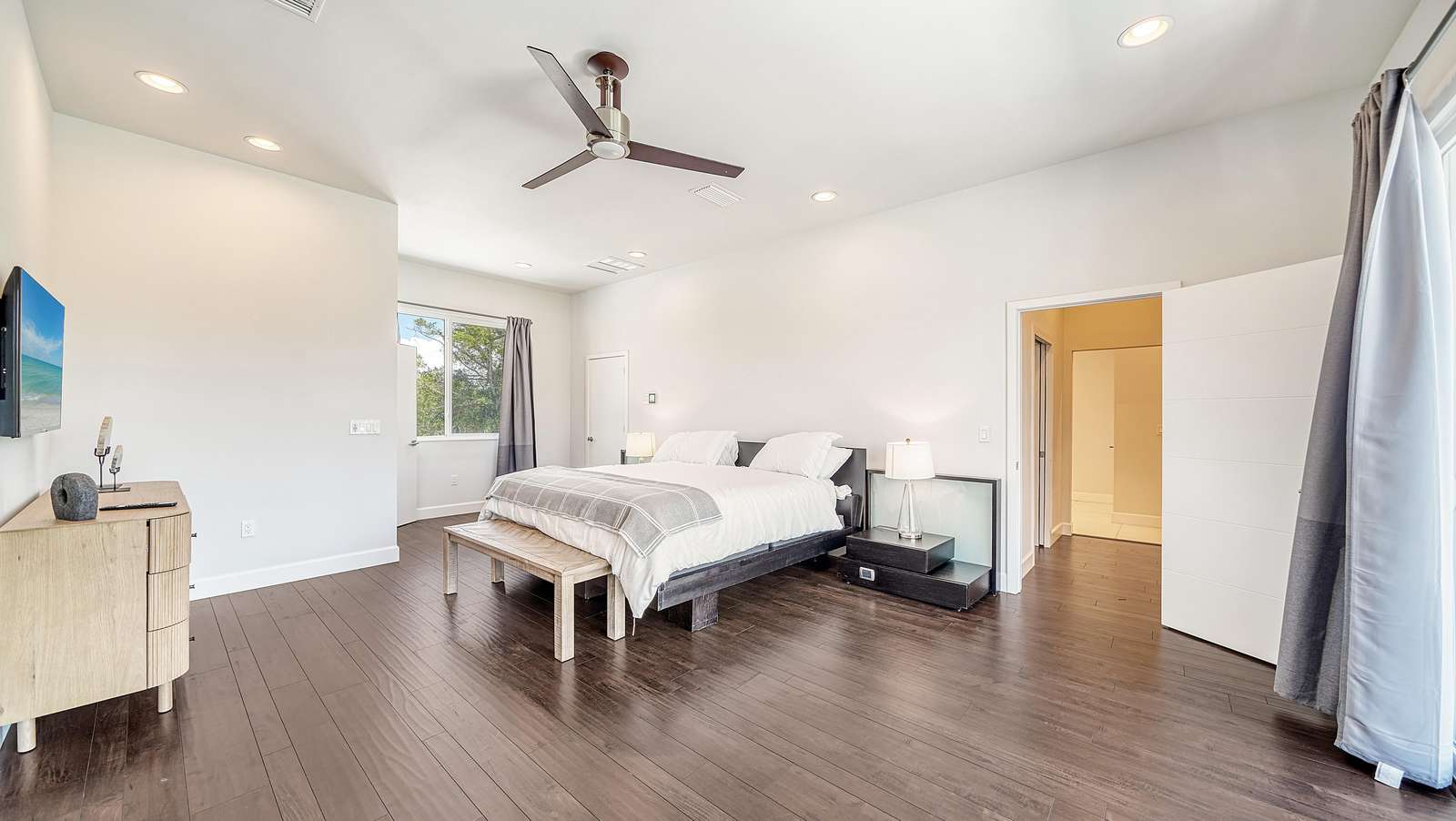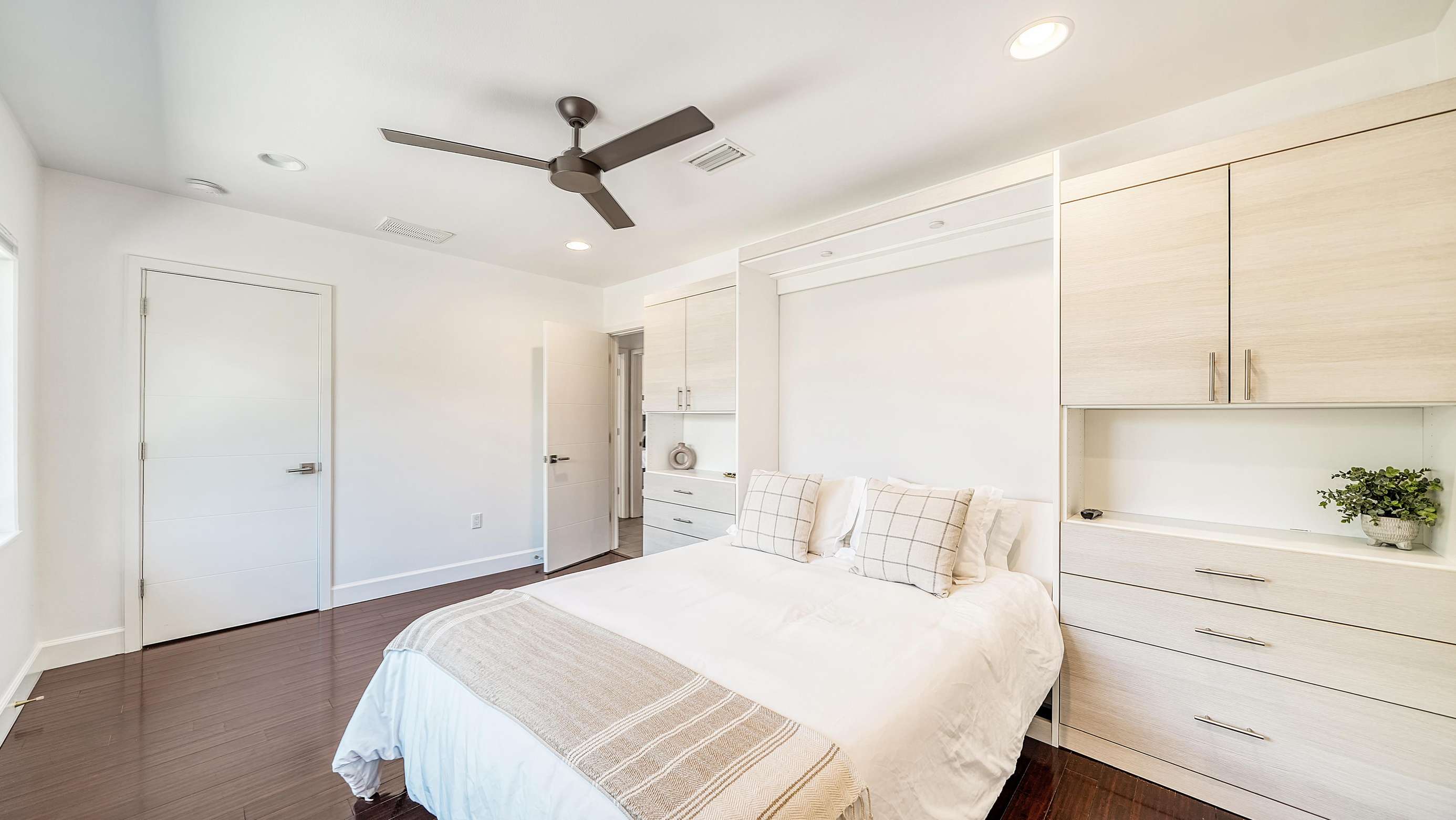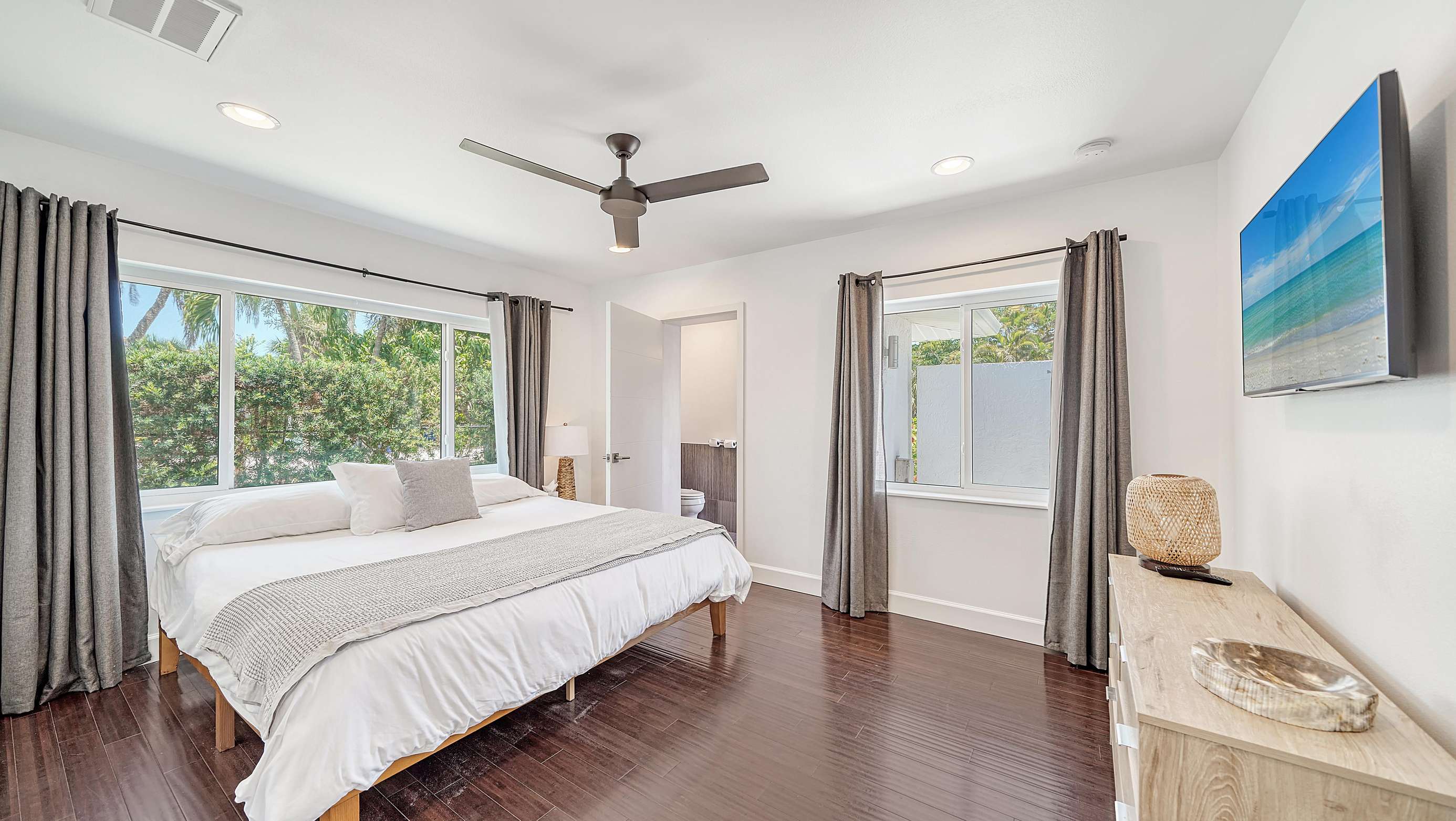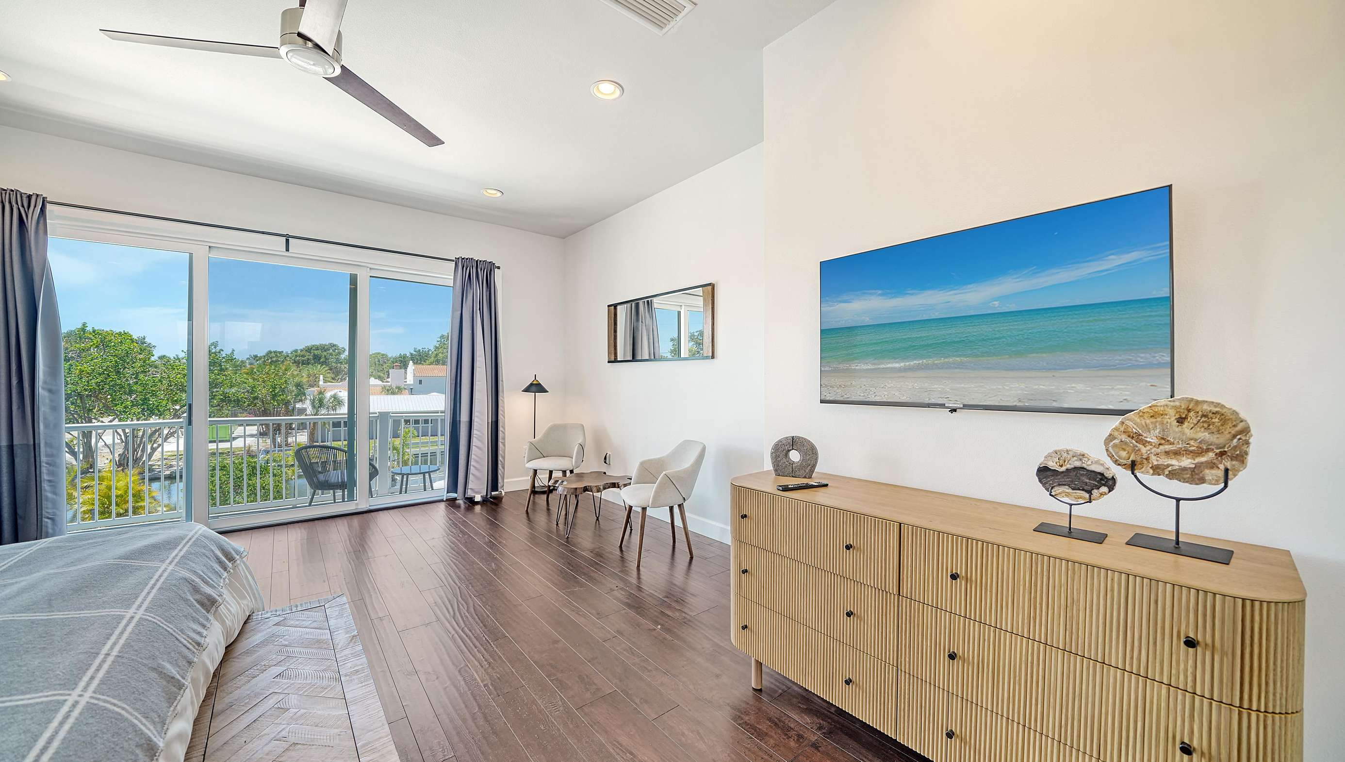The master bedroom is located on the 2nd floor. The large bedroom features a king size bed, and large sliding doors that lead to the balcony with a great view on the pool and canal.