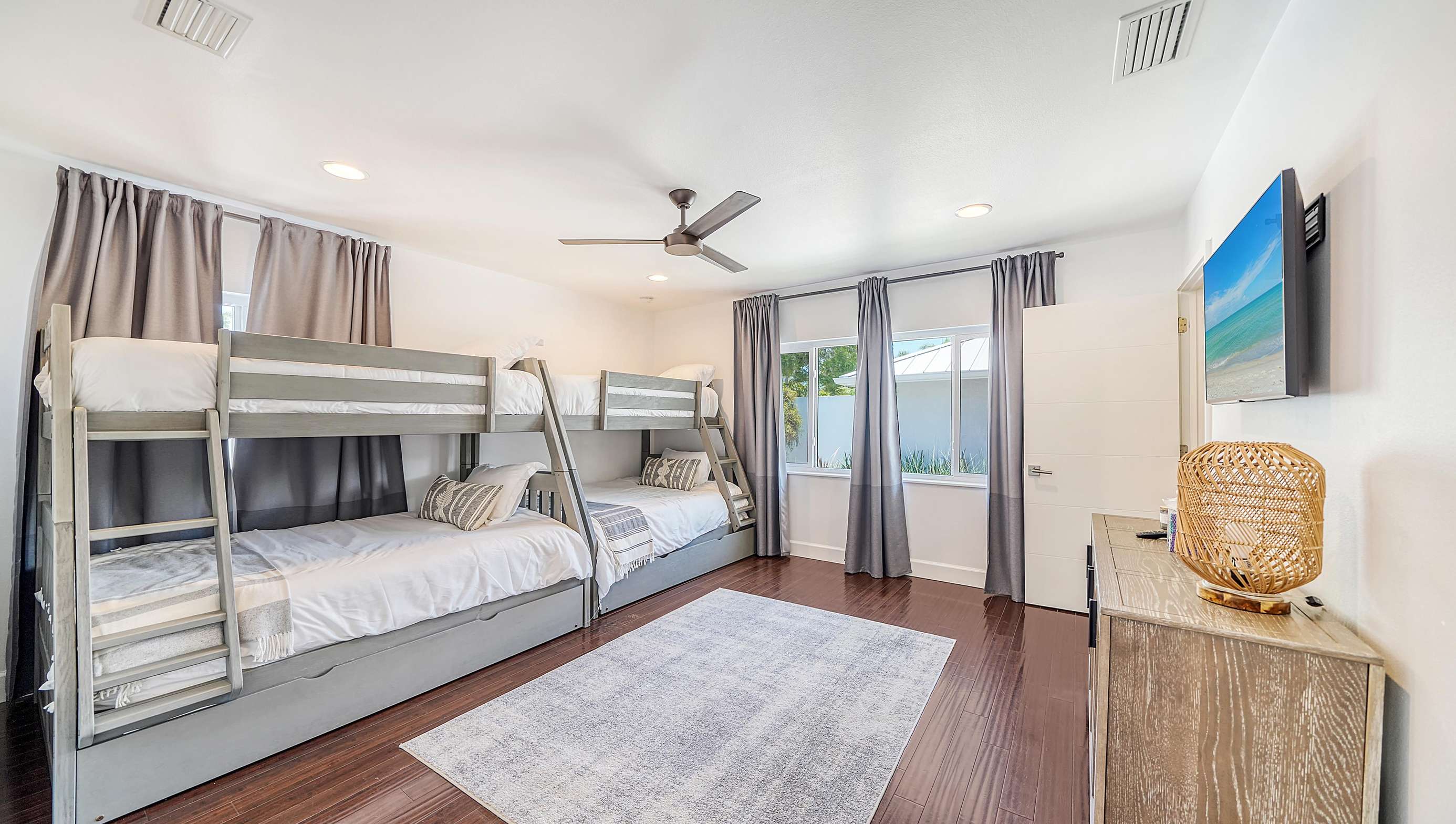 The 4th bedroom has 2 bunk/trundle beds, side by side, that can sleep up to 8 guests. Top bunk beds are twin size, bottom bunk beds are full size and the 2 trundles are twin size.