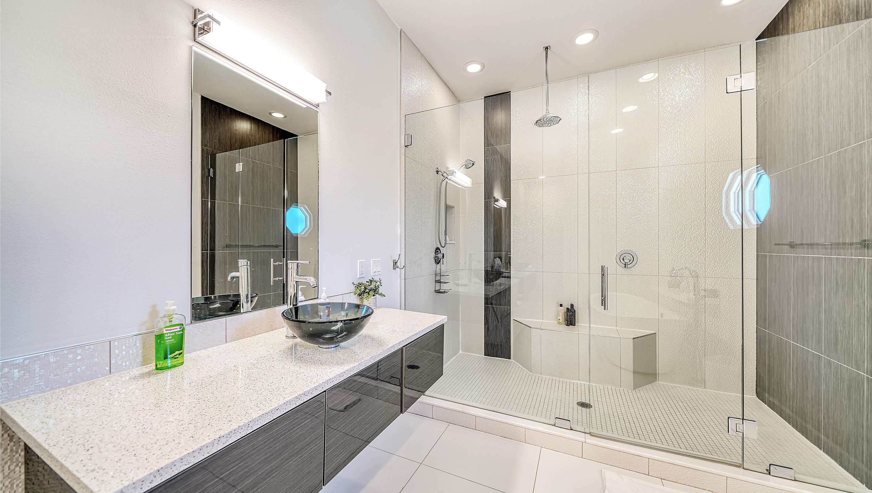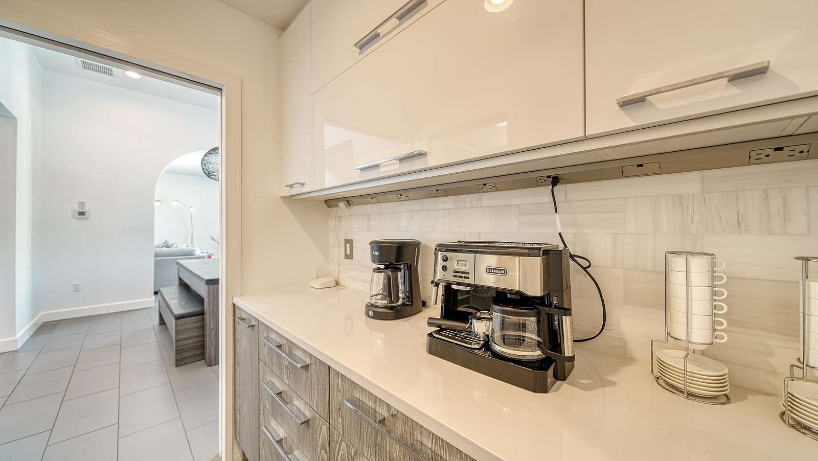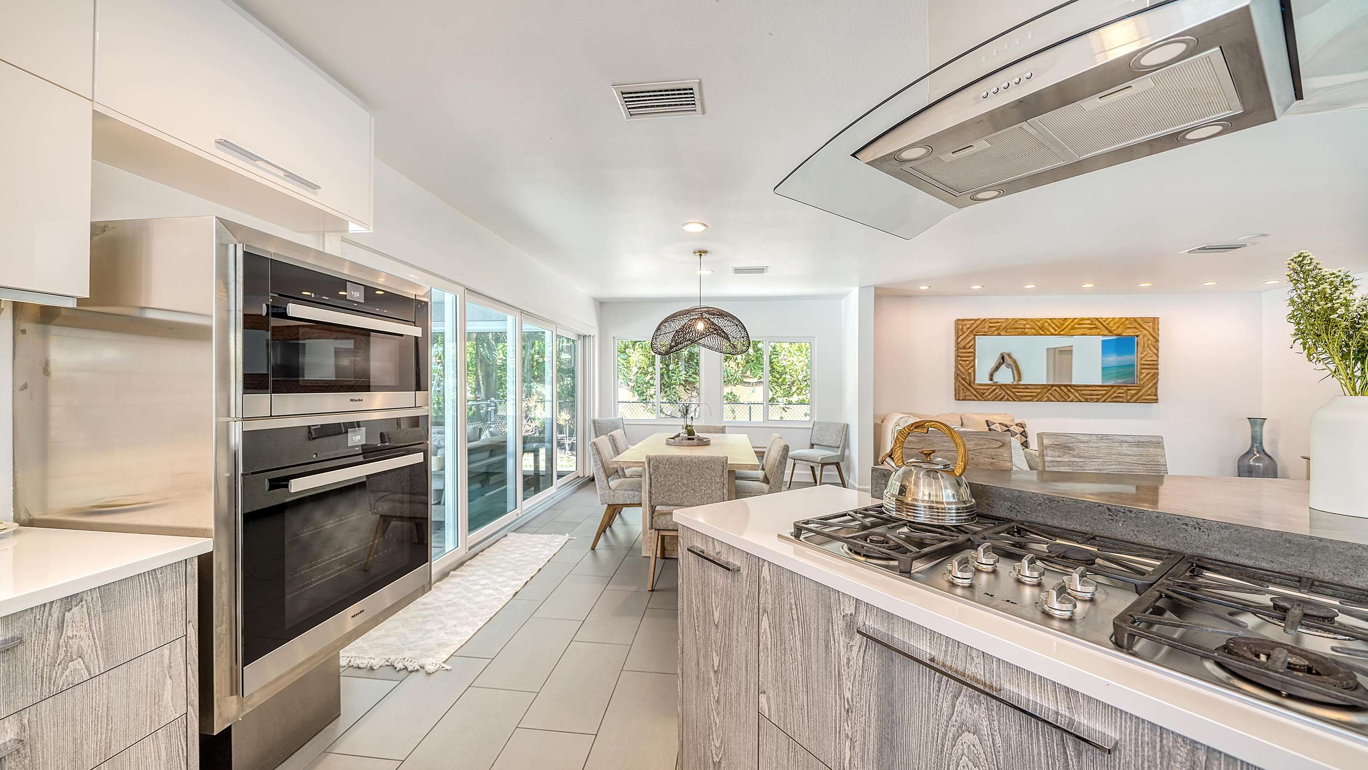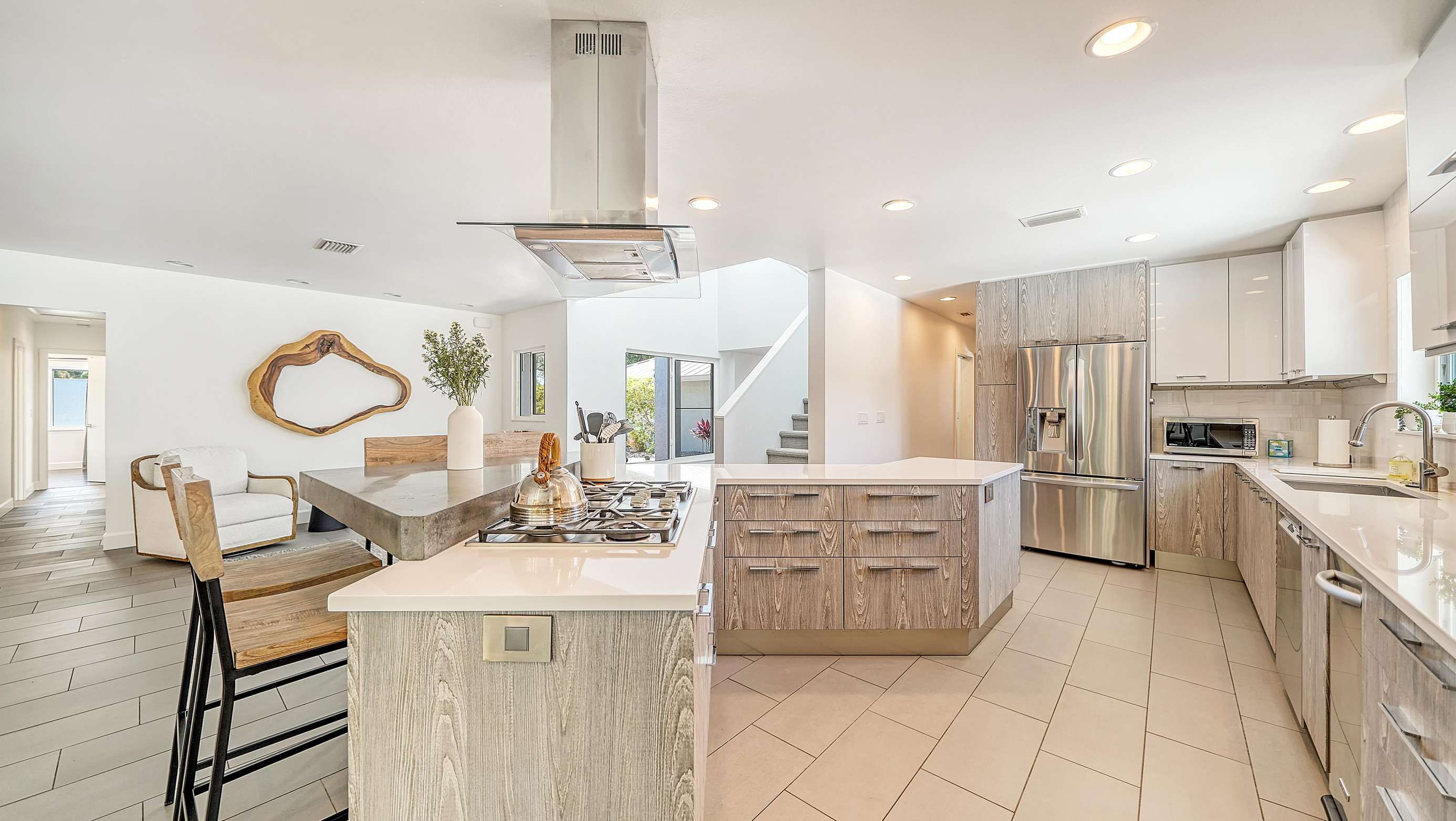 The reconfigured kitchen has new custom cabinets, quartz counter top, an island with a bar area with 4 stools, and all new appliances (including oven, microwave, dishwasher, stove, large fridge).