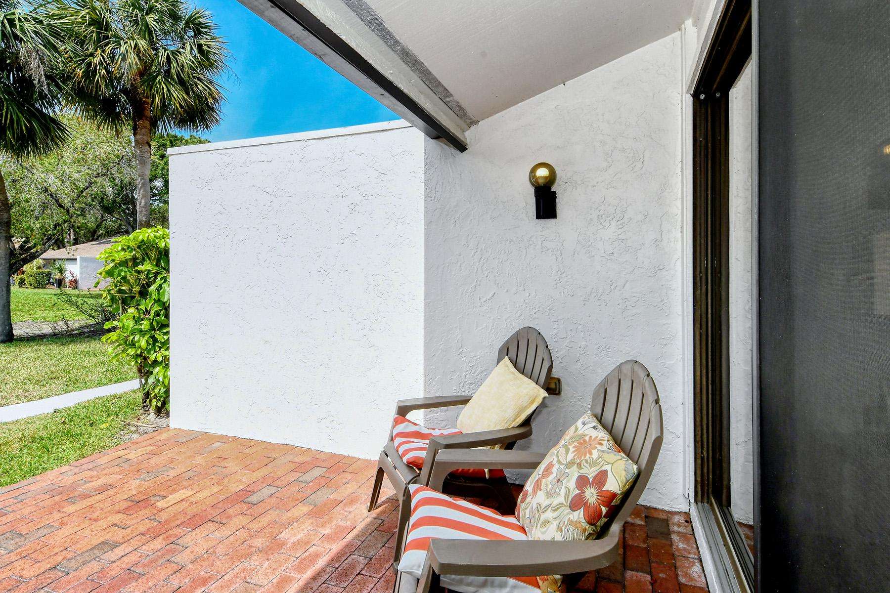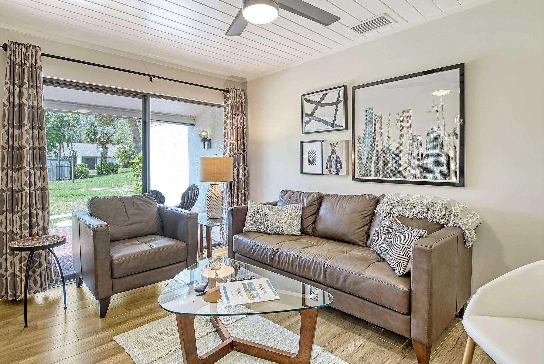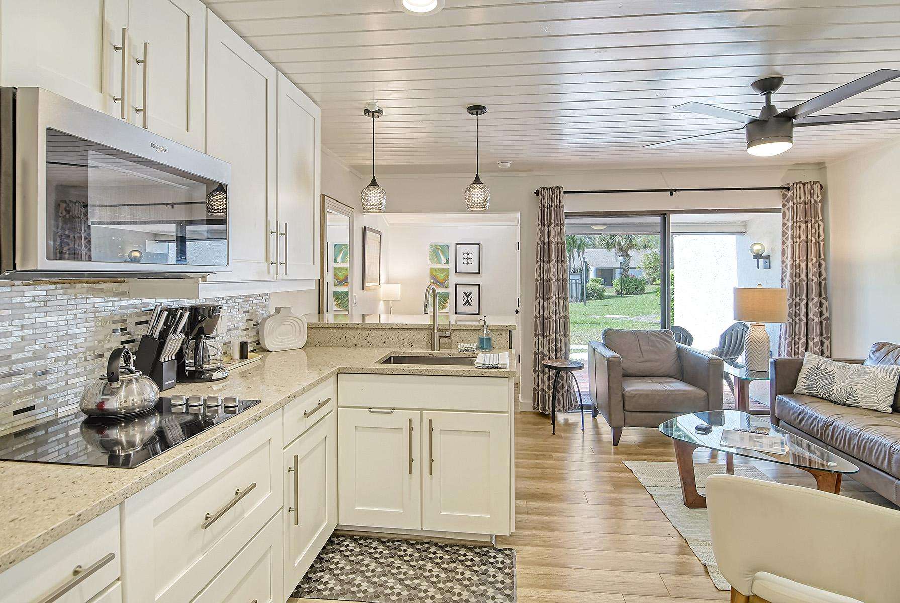 Enter the condo directly into the luminous living room with large sliding windows that open to the paved patio.