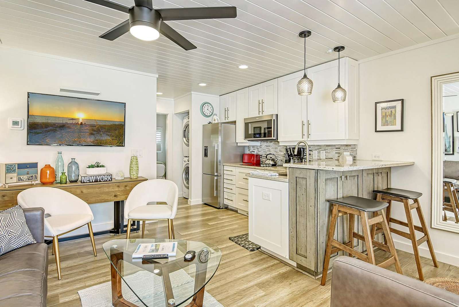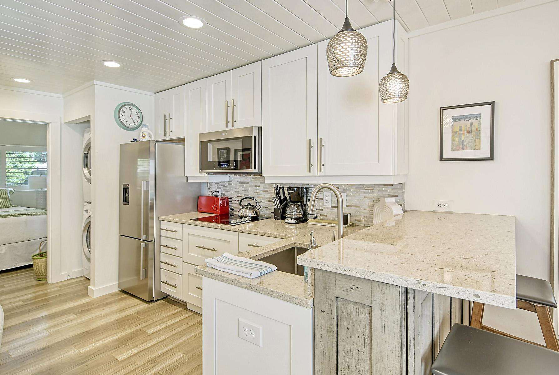 The open-plan kitchen was recently renovated and features a fridge, stove, microwave, water kettle and cooking + eating utensils (there is no dishwasher and no oven).