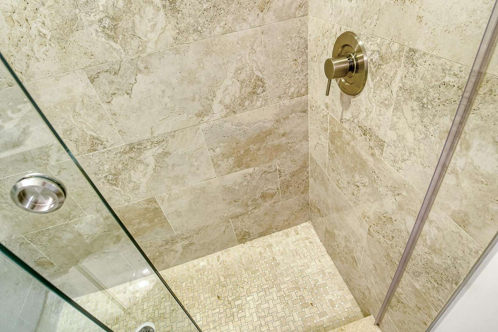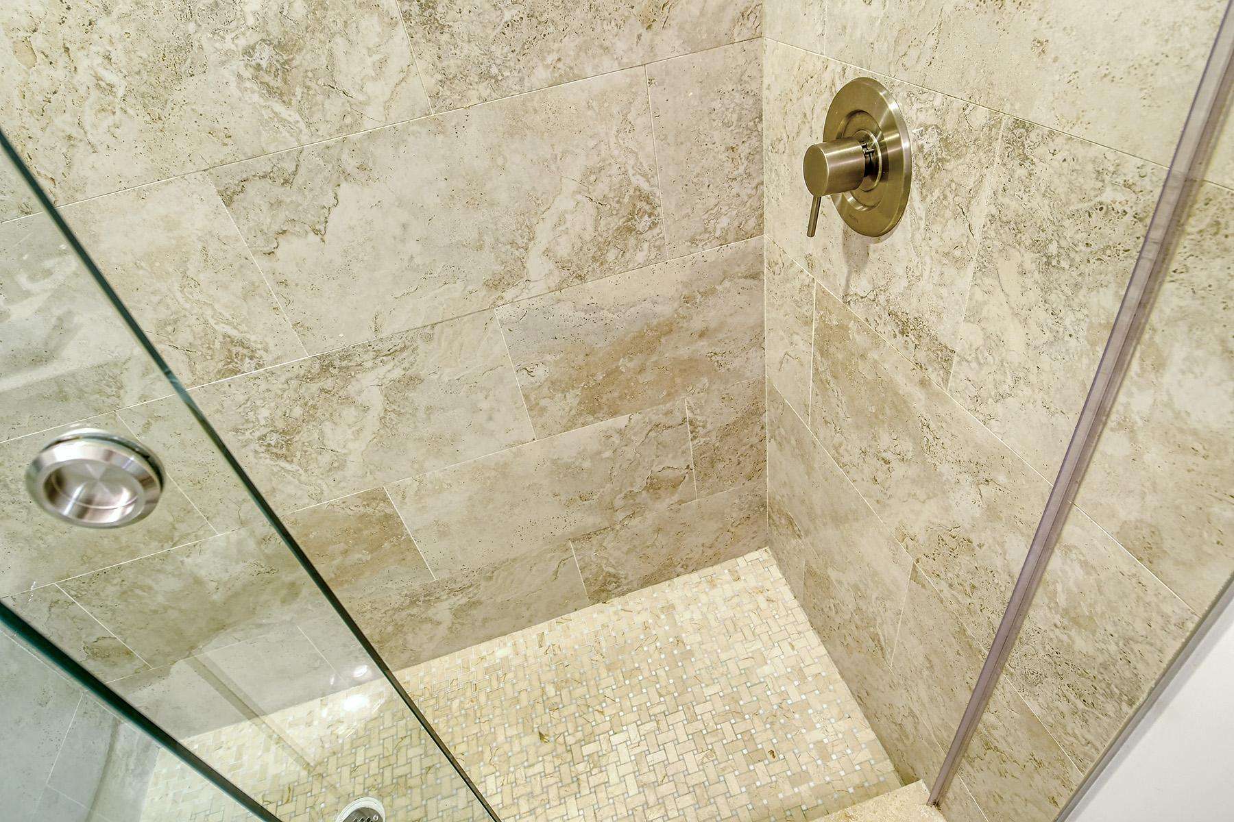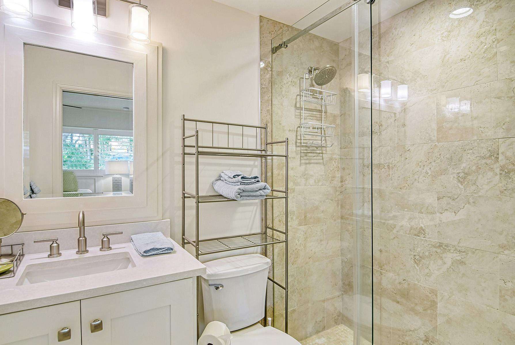 The renovated en-suite bathroom includes a large walk-in shower, toilet, and sink.