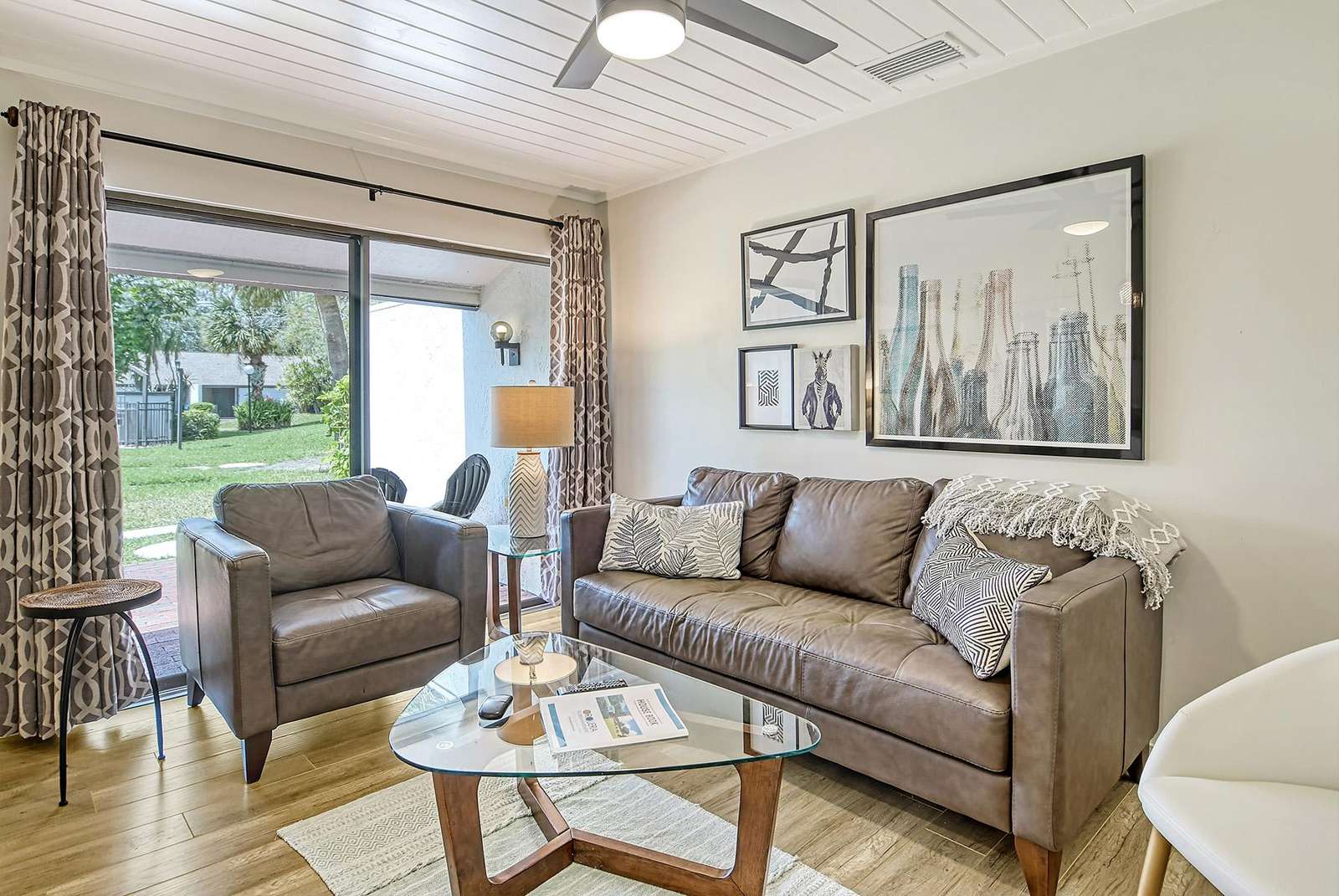 It features a brown couch and an arm chair, a glass coffee table, lamps, and a smart TV.
