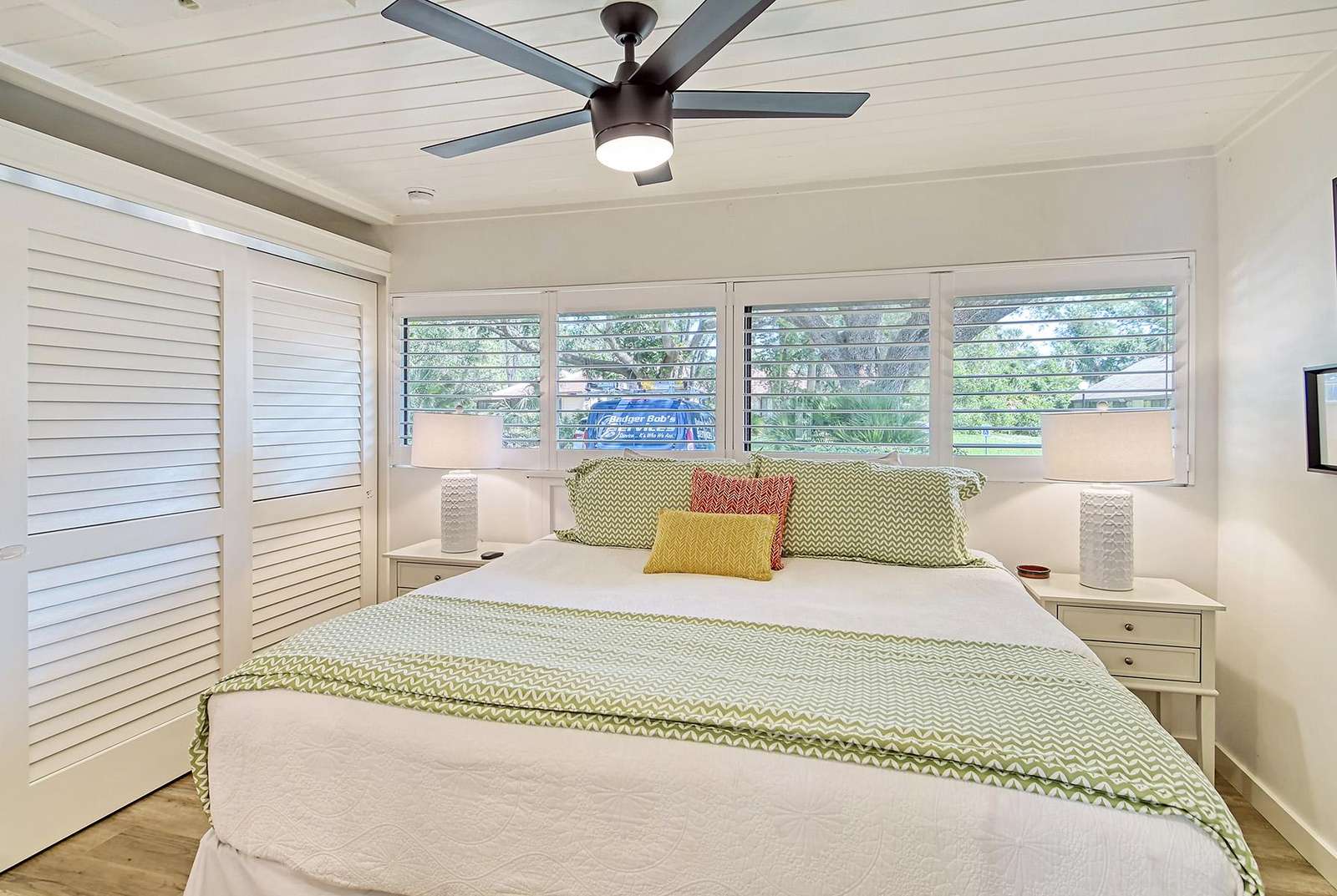 The bedroom features a king-size bed, 2 night stands with lamps, a desk with a chair and a large window.